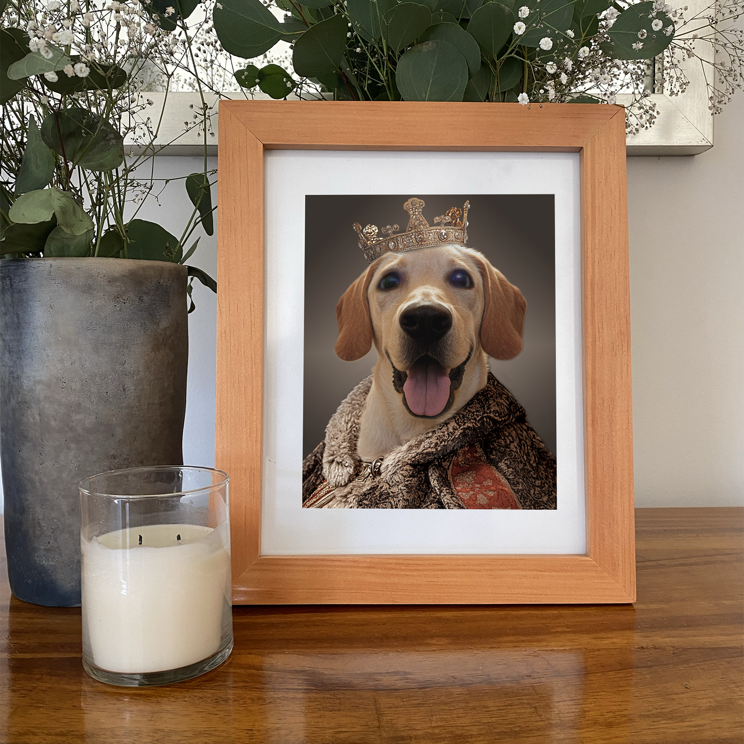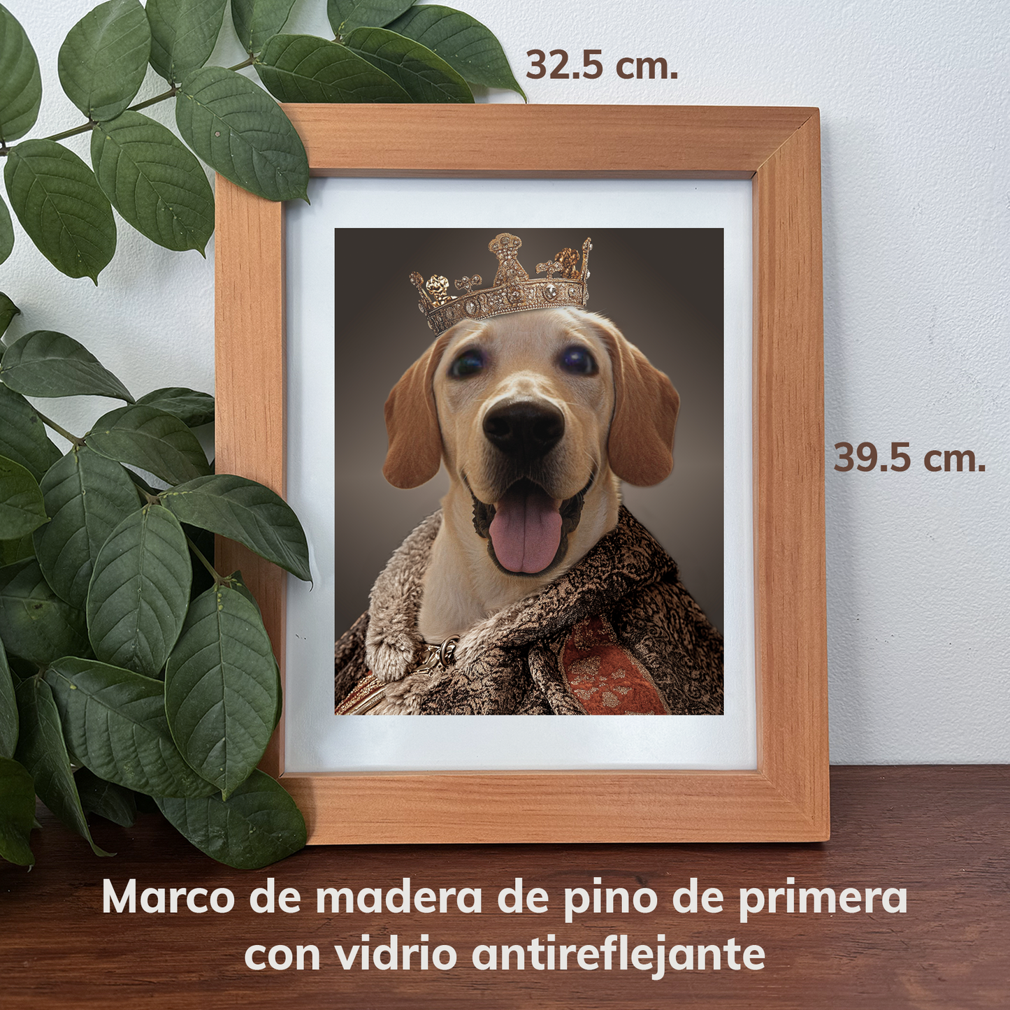 Retrato personalizado para tu mascota con un estilo rey que destaca su nobleza y personalidad única. Ideal para darle un toque elegante y especial a cualquier espacio, celebrando el vínculo inigualable con tu compañero fiel.